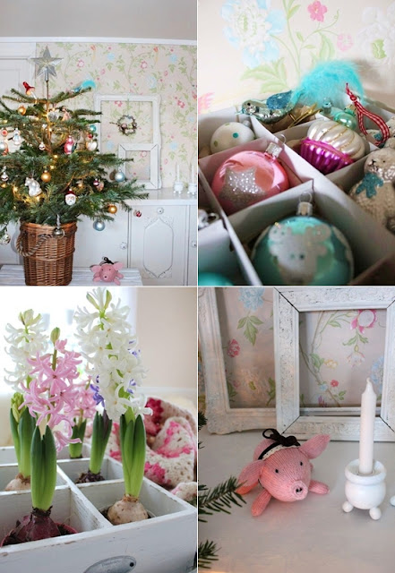Tenke seg til at året snart er omme?! Ikke vet jeg hvor det ble av, borte vekk er det. Jeg er i alle fall klar for et nytt etegilde, og behørig feiring av årsskifte. Bordet er dekket ved hjelp av enkle midler. Spraylakkerte brusflasker er blitt til vaser, og de små urskivene, som ligger strødd rundt om, er klippet ut av hvit kartong, tallene er skrevet med glitterlim. Ballerinaene har jeg klippet ut i papir etter mal som jeg fant i Marie Claire Ideès.
